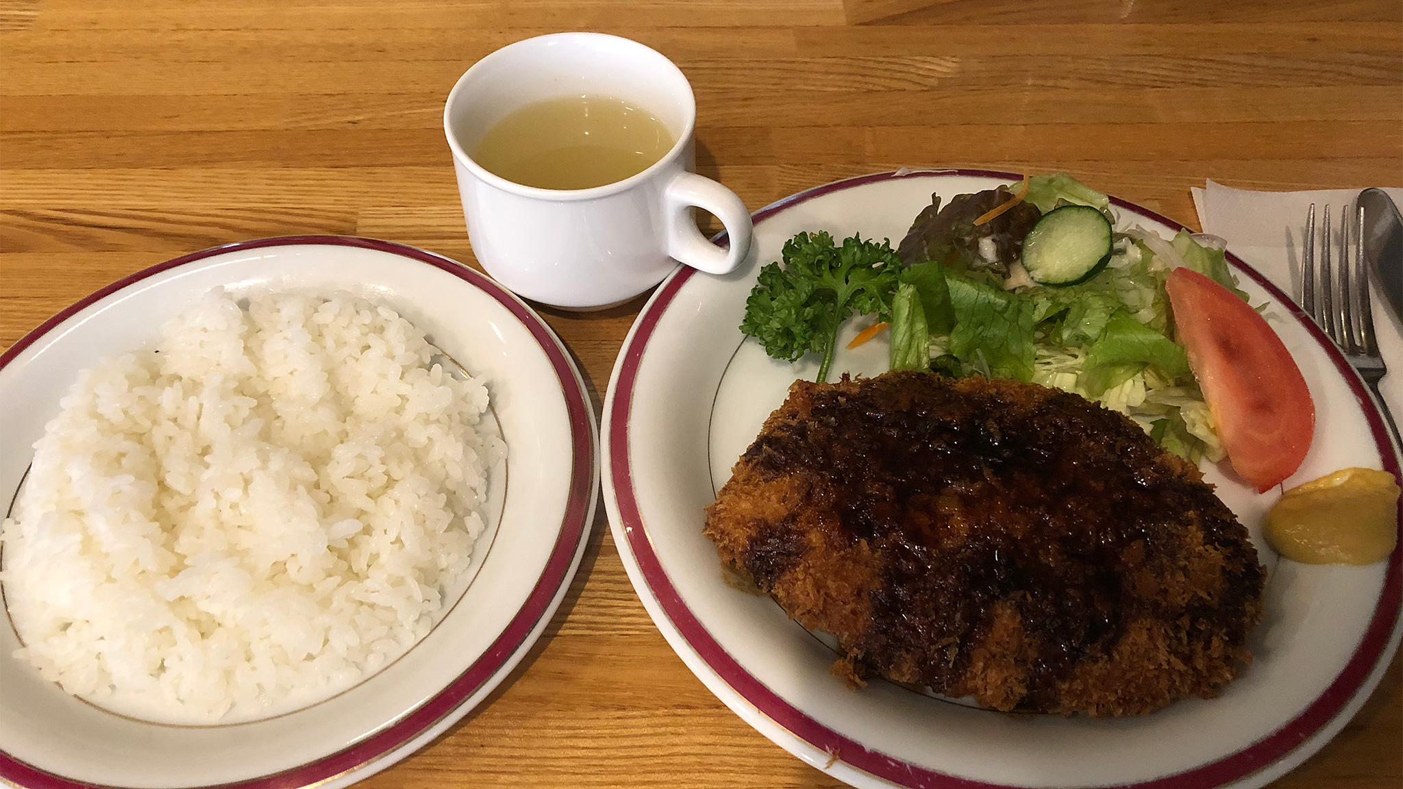 ビクトリアカツはカツレツをイメージしてましたが、予想に反しハンバーグをメンチカツにしたような感じです。マスタードを付けて食べるとよく合います。スープは洋食屋さんの定番、コンソメスープでした。